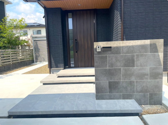 雨の日でも足元が汚れることなく、お家の外壁と似た色味で統一感ある外観になりました。