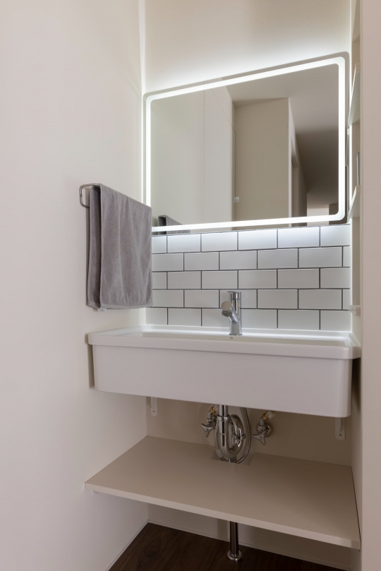 できるだけ無駄のない動きになるように洗面室に設けた2つの出入り口は、廊下からの生活動線とキッチンからの家事動線を短縮化。朝起きてからの一連の動きも一段とスムーズに。