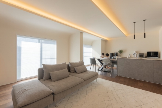 生活感を抑えたすっきりとした空間と、家事負担を軽減できる機能的な住まいへ。空間を分断していた柱を整えることで、キッチンから外へと視線が抜ける開放的なLDKを創り出しました。R天井と間接照明が空間を柔らかな光で包み込み、細部のノイズを削ぎ落とした静かな心地よさを演出。リノベーションで生まれたゆとりが、二世代のほどよい距離感と、穏やかな日常を育みます。