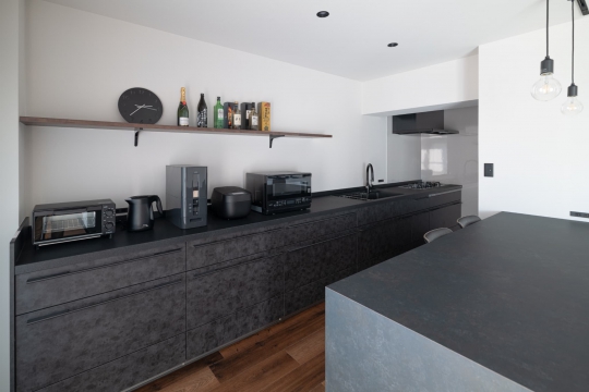 オシャレなバーの雰囲気を出したいという施主様のご希望に合わせて、全体的にシックで落ち着いた雰囲気に。キッチン背面に飾り棚と間接照明を取り入れることでよりお酒の映える演出を行いました。スキップフロアや隠し扉を計画し、遊び心満載の空間に仕上げています。