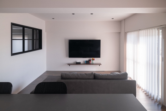 LDKの解放感ある掃き出し窓には、障子を設置しました。障子のすっと伸びる直線的なラインは、シンプルながらもいくつか連なることで主張的なデザインとなり、洗練された和モダンな雰囲気を演出しています。
