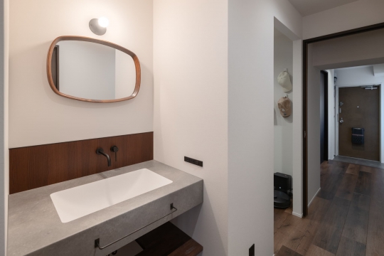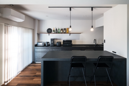 黒を基調とした空間に木目を取り入れ、かっこよさの中にやわらかさを感じられる住まいに仕上げました。壁式構造により撤去できない壁を活かしながら、開放感とスムーズな動線を両立。スペースの制約から廊下に配置した洗面は、トイレや寝室、玄関からもアクセスしやすい計画としています。