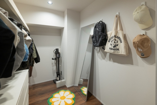 収納量を確保したいというご要望をもとに、用途や間取りに合わせて収納スペースを造作しました。収納の面材は木目が美しいオーク材で統一。高い耐水性と耐久性を持つ木材なので長くお使いいただけます。
