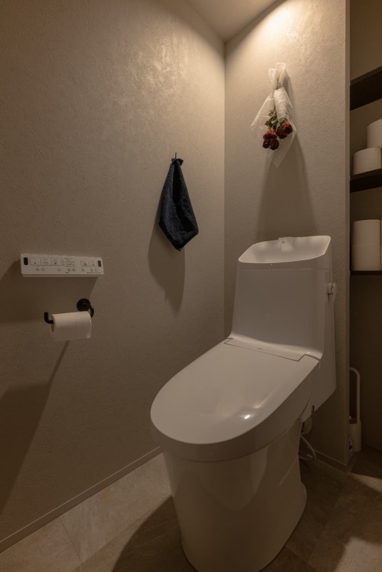 随所に柔らかなアーチを描き、大人の「可愛い」を極めた空間をデザイン。突板フローリングやタイル、TV背面にあしらった無垢材が温もりを添え、心地よさを高めました。そして、住宅設備をはじめ、照明・カーテン・エアコンまでIoT機器を導入し、快適性を向上。豊かな採光と内窓による高い断熱・防音性能で静かで快適な暮らしを叶えました。