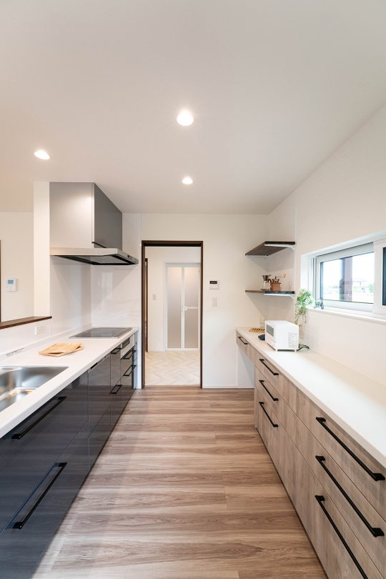 (奥様)キッチンも通常よりも広めにしてもらったおかげで、キッチンとカップボード両方の扉を開けてもぶつからないですし、後ろに人が通っても楽に通れます。