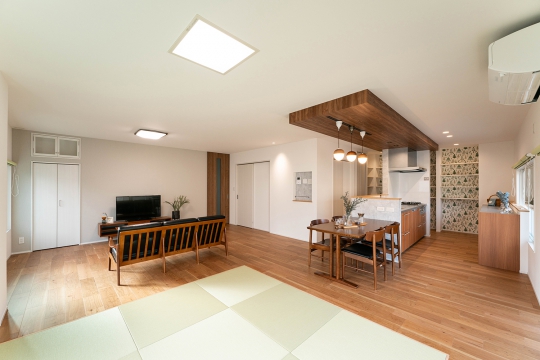 壁を取り払い、光と風が抜ける開放的なLDKを実現。無垢材やタイル、間接照明など、素材やディテールにもこだわることで、住まう人の感性に寄り添う空間に仕上げます。