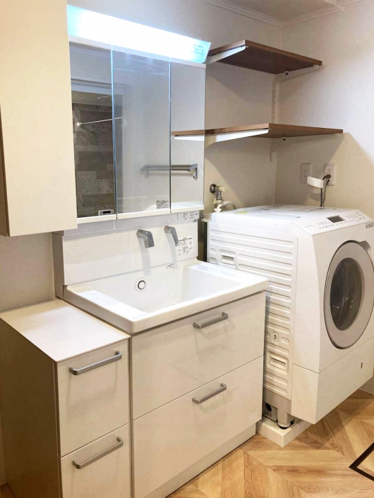 洗面周辺は、すっきり見える収納や洗濯機上棚を採用し
