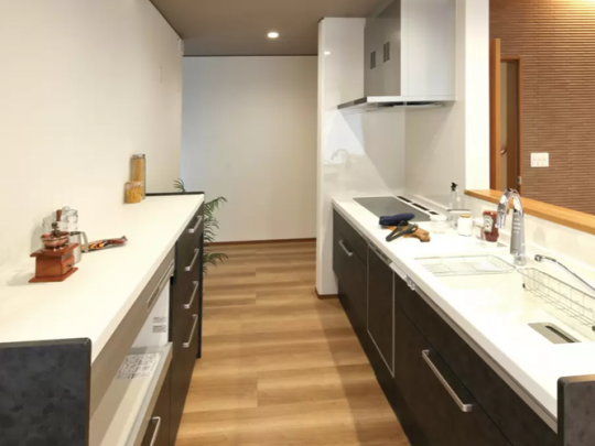 横並びのダイニングキッチンは家族で料理や食事を楽しめる、コミュニケーション高まるオススメの提案です。