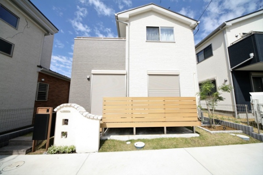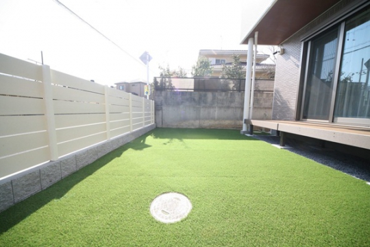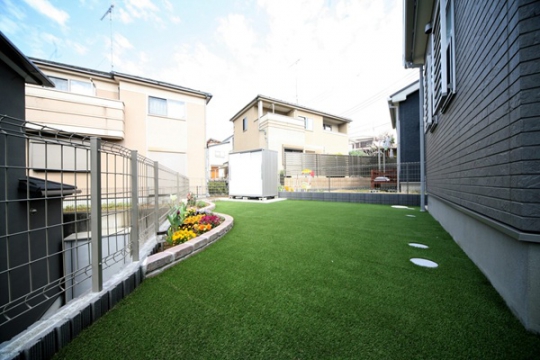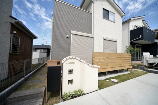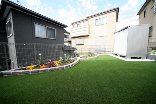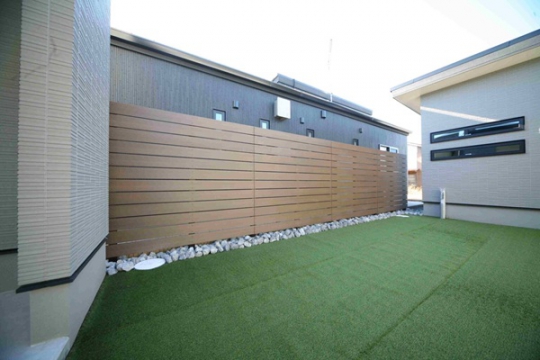 新築時に駐車場・アプローチ・宅配ポストのみでお引き渡されており、土の面積が沢山ある状態でした、リビングから目線も気になるとの事から目隠しフェンス・デッキを取付、掃き出し窓から出入りできるようにしました。転落防止と目隠しの効果が出ました。門袖はオーナー様が一番拘って頂き、優しい感じに仕上がりました、裏のお庭は花壇スペースを設け、お庭道具を収納するため物置も設置、グランドカバーには人工芝を敷き込み完成