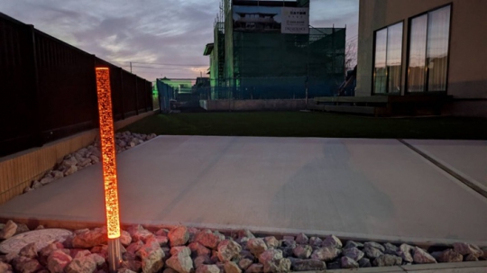 クレアカーサ様の工事にて展示場となります、オープンのシンプルモダンスタイルなつくりとなっております、オリジナル商材を取入れて頂きクレアカーサ様ならではのオリジナルな外構となっております、駐車スペースは2台と広々としたお庭にはデッキと人工芝の組み合わせ、照明の一条の光はオレンジカラーを取入れてみました、植栽や建物の壁にライトアップすれば、この様な仕上がりになります。