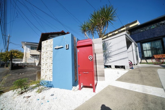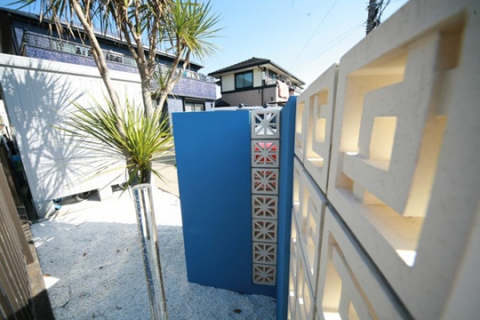 駐車場の拡大と機能門柱が1本だけの外構でしたので、明るく他にはない門周りをとの御依頼、私の好きなリゾート感が作れればとプランニングさせて頂いた次第です。お洒落なポーラスブロックをお勧めさせて頂き、門袖もクランク型にしポーラスブロックの種類を変えたり塗装部分と木目のタイルを張ってみました。どこから見ても華やかになるブルーとレッドでとてもオンリーワンな仕上がりになりました。
