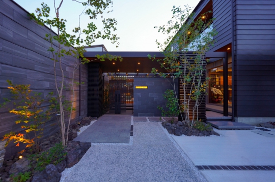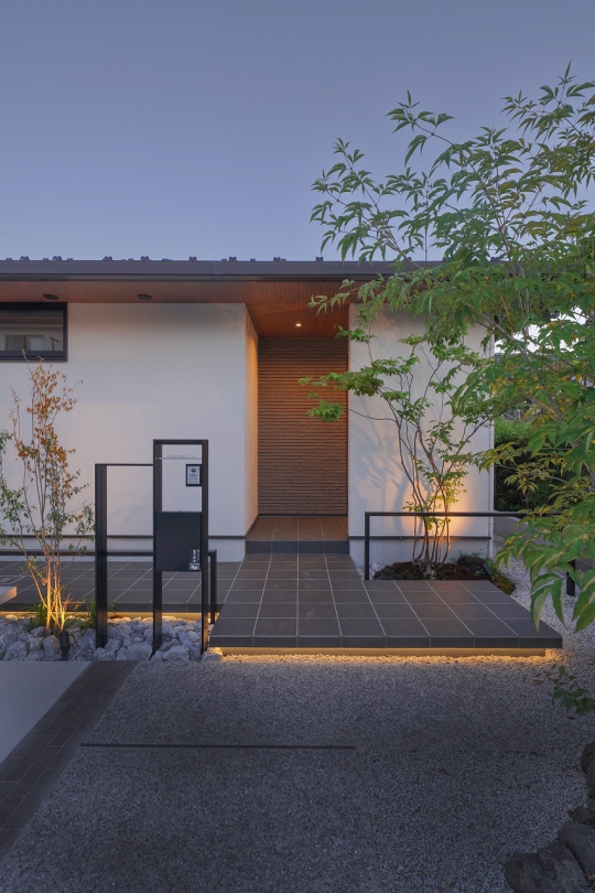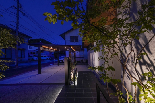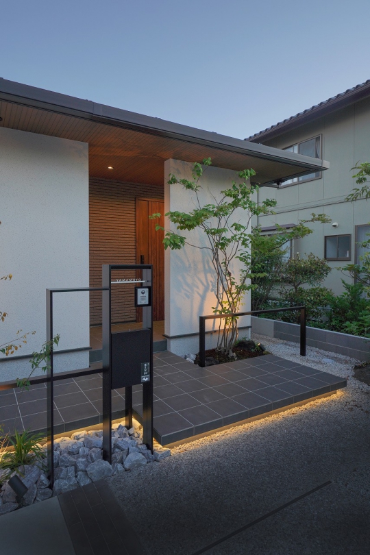 照明にプリュードを合わせることで玄関前では軽さを表現。
