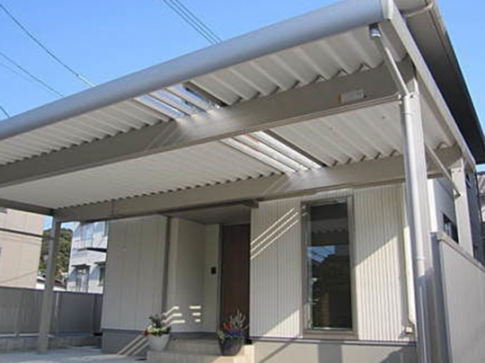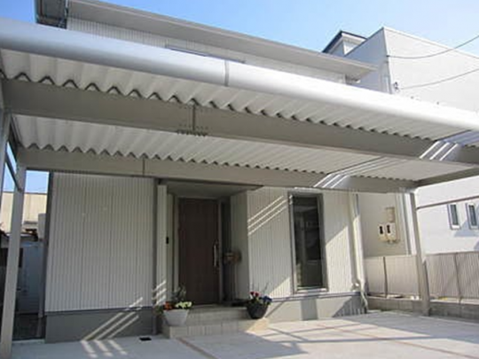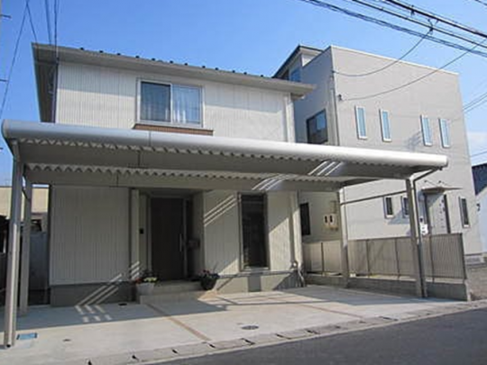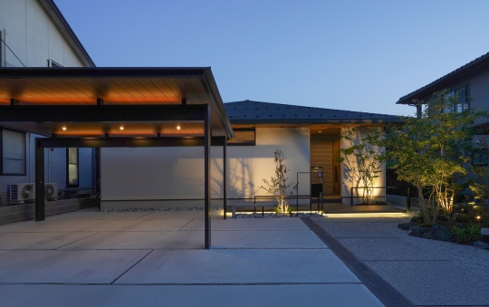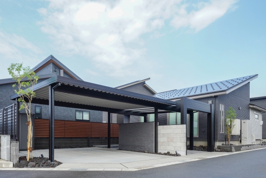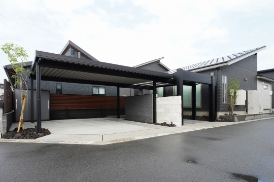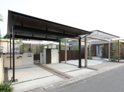 シャッターゲートとカーポートで空間をしっかりと仕切る、シンプルで重厚感のあるスタイル。