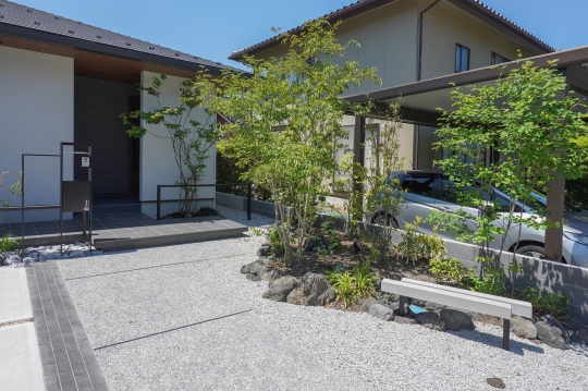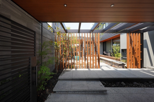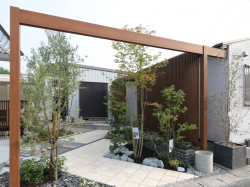 お施主様はもちろん前を通る人、観る人を豊かな気持ちにさせる外構。高いウォール壁とルーフフレームで仕切られた