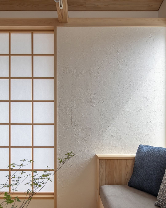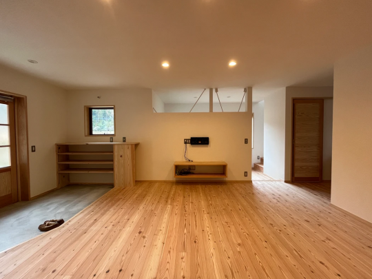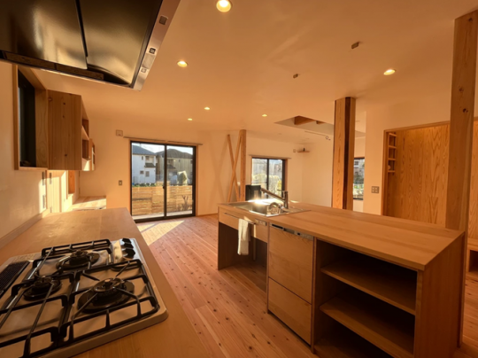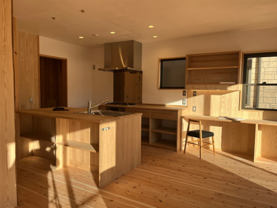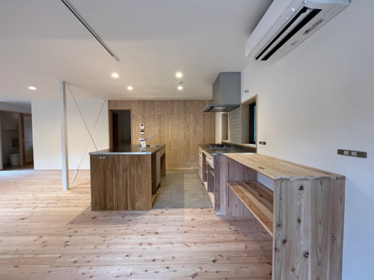 無垢の床、漆喰の壁、キッチン・建具は職人さんの造作です。