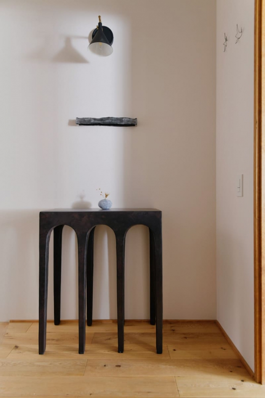 常設は空間の仕上げに加え、玄関の棚や自作したベンチなど。棚は家具ながら建築物というか…アートの一部のように感じられます。