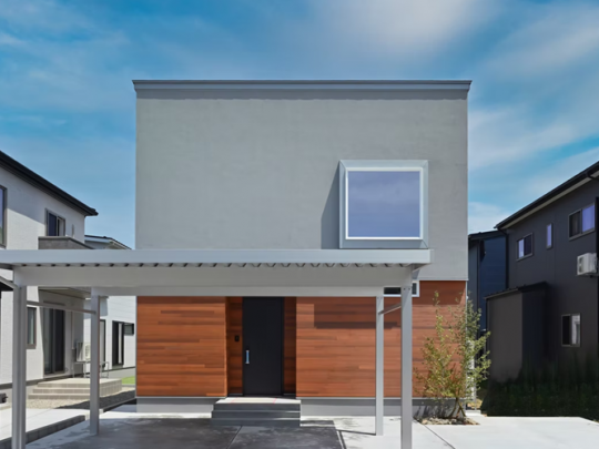 外観は塗り壁に、正面のレッドシダーがアクセントに。