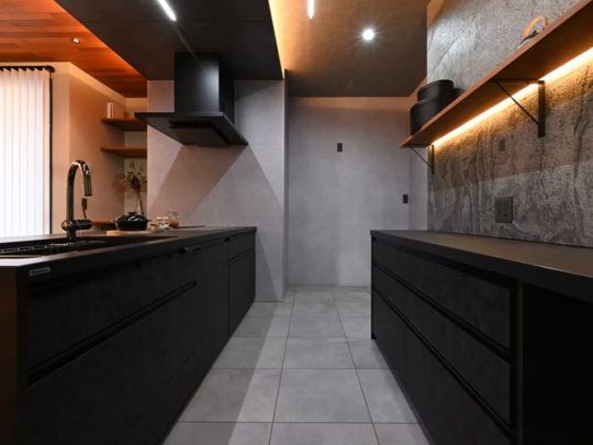 キッチンにはブラックカラーでスタイリッシュな最高グレード仕様のものを採用。