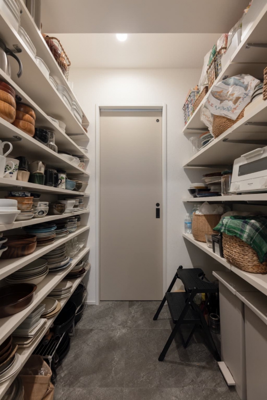 以前の住まいで感じていた収納の少なさによる散らかるストレスを、新たな住まいづくりのヒントに。生活感が出るモノは隠す収納を活用することで、いつでも綺麗な状態をキープ。随所に散りばめたタイルやアイアン、真鍮などそれぞれの素材感が、スッキリ片付いた空間の中でより美しく引き立ちます。